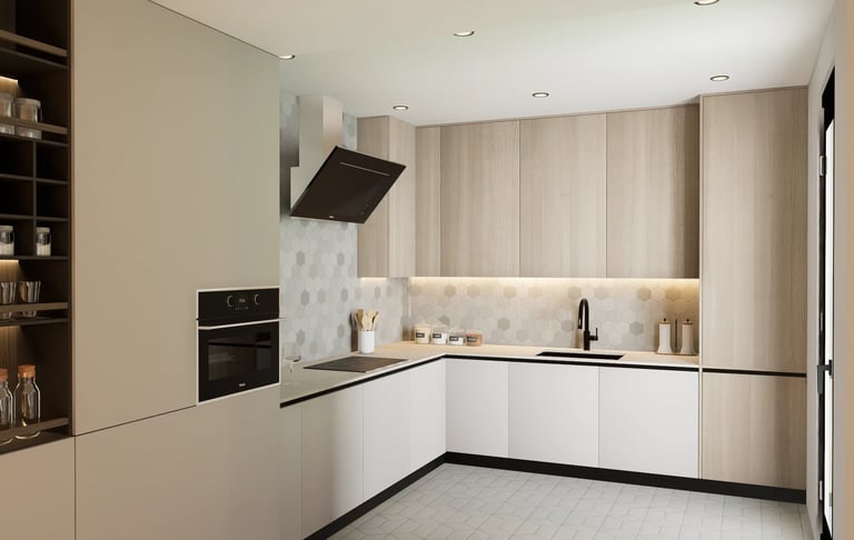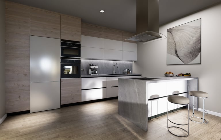 El proyecto se caracteriza por una distribución equilibrada, donde cada estancia tiene su propósito y su propio carácter. Las cocinas cerradas ofrecen intimidad y orden visual, separando las zonas de trabajo del resto de la vivienda, sin renunciar a la sensación de amplitud y bienestar que define el conjunto.
